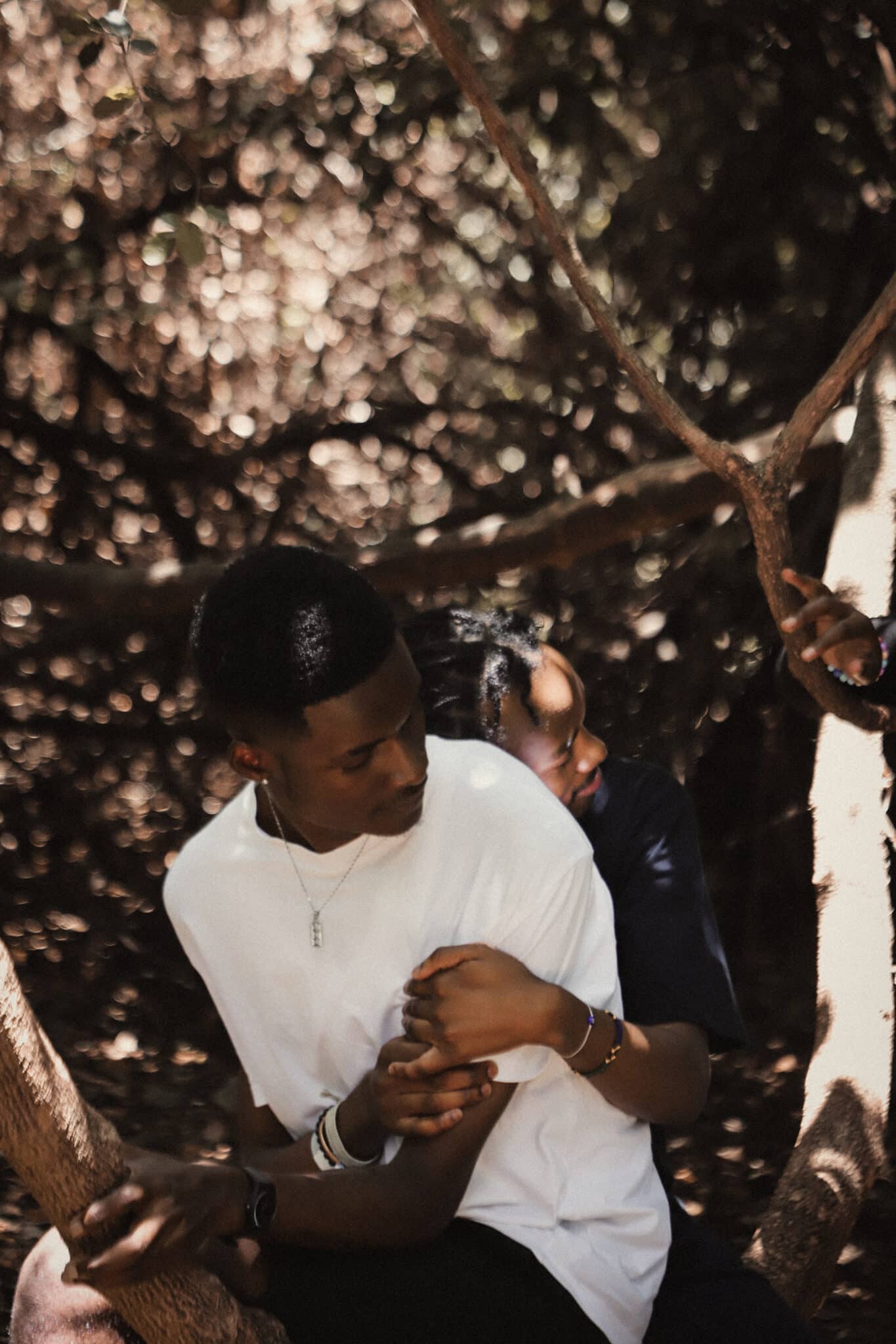 J and B share a tender moment in a forest. “It’s such a relief not to have to worry about who might see me, and just express how I feel in the moment”.